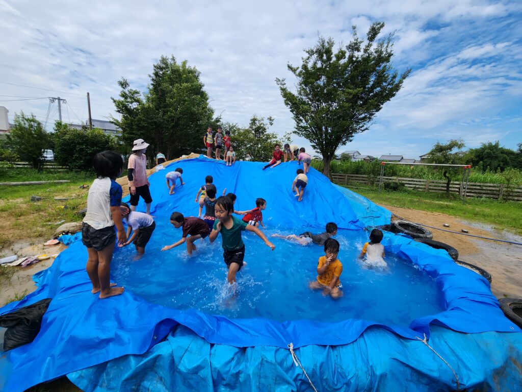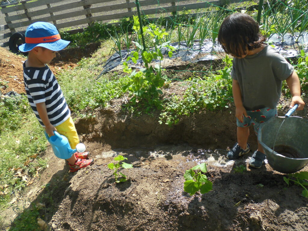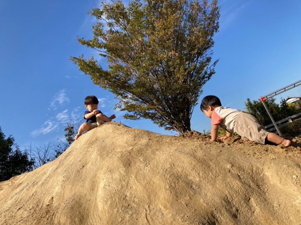 汚れを気にせず思いっきり泥まみれ、水まみれになって一心に遊びます。土や泥・水は、子どもの思い通りに遊べる素材です。